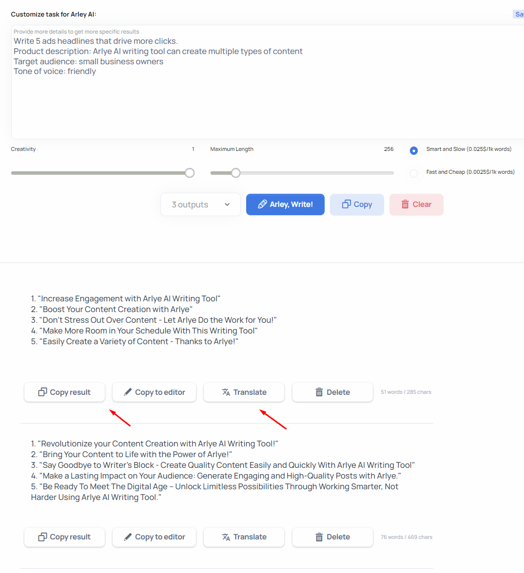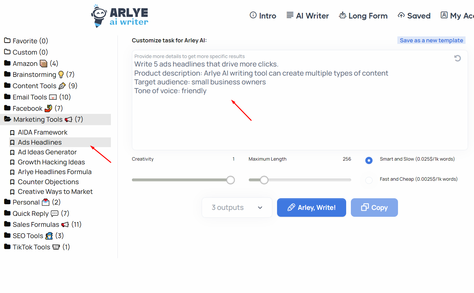 Choose template or create own. Customize task for AI and click "Arlye, Write!"
