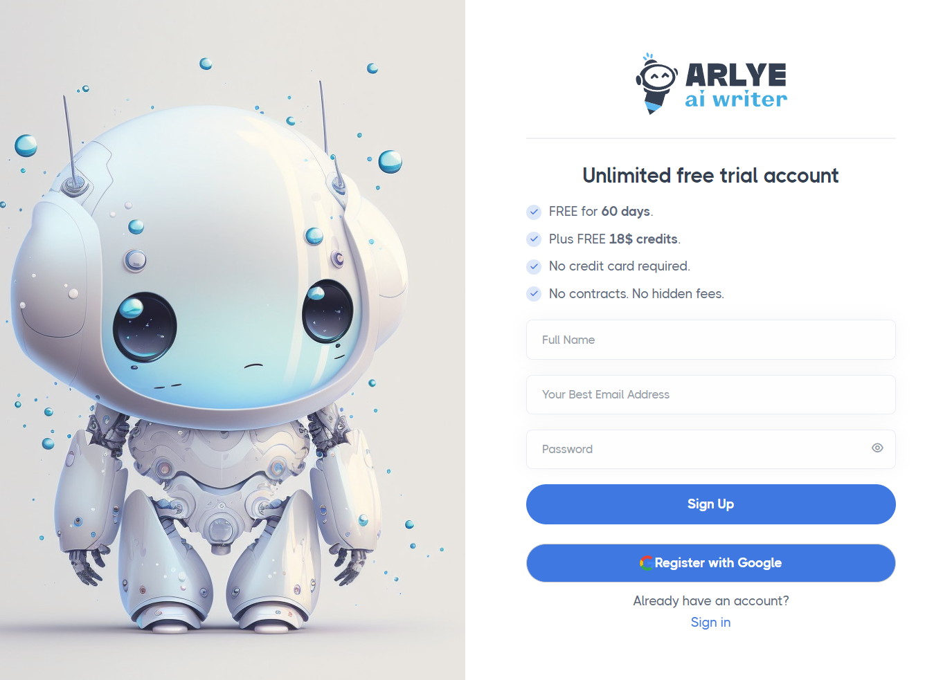 ## <mark style="background-color:green;">STEP 1:</mark> Register your 60 days  👉[free trial account](https://arlye.ai/register)